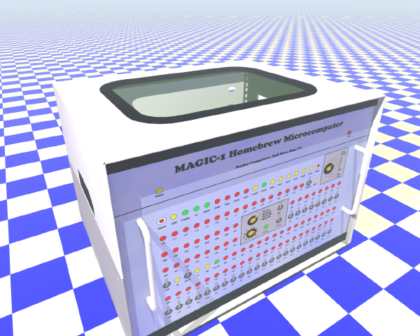 I didn't get a chance to make a drilling template for the card cage. Perhaps tomorrow. 4/23/2005Lots of progress in the garage (filled the van with garbage and took it to the dump). Lots of progress in the back yard (repaired long-broken sprinkler system). Lots of progress cleaning the house (and doing laundry). Little progress on Magic-1. I did sneak a few minutes and built up a couple of small items. First, I put together a couple of 30 Ohm power resisters with a standard PC power socket. I'll use this to give me the 800 ma 12 volt minimum current required by my switching power supply. Second, I drilled a few of the holes I needed in the perf board and mounted the brackets, both IDE drives and the switches. I still have to do a bit of wiring (mostly bringing the switches to the 10-pin ribbon cable socket). The bracket side will be mounted flush against the lower back panel. I'll cut a slot to allow insertion of a compact flash card, and will also put a pencil-sized hole at the position of the red push button. That's RESET, and it will be recessed to avoid accidents. I hope to put together a set of hole templates tomorrow (back panel, and mounting holes for the power resistors and card cage on the bottom of the enclosure). If I can get those, I'll stop by a friend's house after work tomorrow and use his drill press. 4/22/2005Picked up the other main acrylic piece from Tap Plastics today. It's the new top for the card cage, with the center cut out to allow me to swap microcode EPROMs without removing the control card. I think it looks really nice: I only had a few minutes to play between chores, but I did manage to cut a new platform for the IDE drives out of perfboard. The first was a bit crowded. Also, I have two IDE <-> compact flash adapters. The first one I tried took up less space, but I realized that the CF card wouldn't stick out of the slot I'm going to cut in the lower back cover very far at all (and would make it really difficult to pull the card out). The other adapter will allow me to have up to a half-inch or so of the card sticking out, but it takes up more floor space. Anyway, I've decided to use the latter (with about a 1/4 inch of the card sticking out). Also, since I've got more place to play with, I'm experimenting with mounting the HP Kittyhawk drive flat rather than on its side. With luck, I'll find the time to drill mounting holes in the perfboard tomorrow and do a mock-up. Once that's done, I'll use the nibbler to cut the CF slot. The slot will be the anchor for the rest of the mounting holes (and the access hole for the reset switch). 4/21/2005It's looking good - really good. The front panel artwork came back from the laminator today, along with the first of the acrylic pieces. I used 5 mil glossy lamination (both sides, done at Kinko's). It only took a hour or so with my 7 mm circle hole punch and .5" square Xacto blade to cut out all of the holes. Made a nice mess, but worked really well. The circle punch was especially useful - it would have been a nightmare to try to cut all of those circles with a blade. The only mishap of the night came when I drilled the tiny hole near the register select switch. The hole is for the tab of a slotted washer that keeps the rotary switch from slipping with use. I'd taken great care in precisely locating the hole (7.5 degrees offset from 12-noon position). Sadly, I thought I could drill it out using my hand-held electric drill. Naturally, the drill bit walked and the hole ended up in the wrong spot. I have to get myself a drill press one of these days. Anyway, I managed to correct my error with a bit of work with a tiny file. I installed the switch for testing and it is aligned just right. Next up was attaching the artwork to the front panel. I smeared the back side (mostly just the edges) of the artwork with tacky glue. I then slapped it on and put in the LED clips to align everything and hold it down while it dries. In truth, I probably could have gotten away without glue - the lamination makes it pretty stiff and all of the LEDs and switches will hold things down. Here's a picture of the shield. It's actually clear acrylic, but I'm keeping the protective covers as long as I can. Here's how it is going to work: Unfortunately, it looks like I'm going to have a very busy weekend. My wife is throwing a party of sorts next Friday, which means lots of house cleaning and the long list of household repairs I've been ignoring for months. If I do find some time, my focus will be on the platform that will hold the IDE drives and clock control switches. After that, it will be time to drill the card cage mounting holes. After tonight's experience, I'll definitely be borrowing a drill press to do those. 4/20/2005Another very cool addition to Magic-1 arrived today from Alistair Roe - a 7420 with a date code indicating it was manufactured in week 24 of 1969. I'll be adding this device when I reassemble Magic-1 this weekend. I very much like the idea of Magic-1 using a 36-year-old logic element. As Alistair pointed out, this chip was manufactured a month before the Apollo 11 moon landing and about 4 months before the first ever ARPANET message was sent. Soon, it will be playing a key role in Magic-1's processing abilities. Here's a picture: Things are progressing nicely on the front panel and enclosure front. I printed out the final front panel art this morning and sent it off to the copy shop to be laminated. Here's what it will look like: I'm also a few custom Plexiglas parts made to help piece things together. With luck, I'll start wiring up switches and LEDs this weekend. 4/17/2005There wasn't enough room on the front panel for all of the switches that Magic-1 supports. Left off were the clock source select (which chooses between 2 crystals, 1 slow variable-speed clock and a single-step clock), the reset button and a switch that decides whether the 1st 16K bytes of physical address space are mapped to the boot ROM or just RAM. My first 