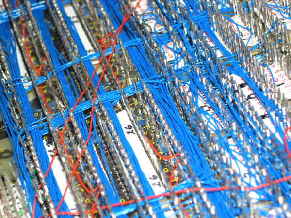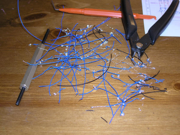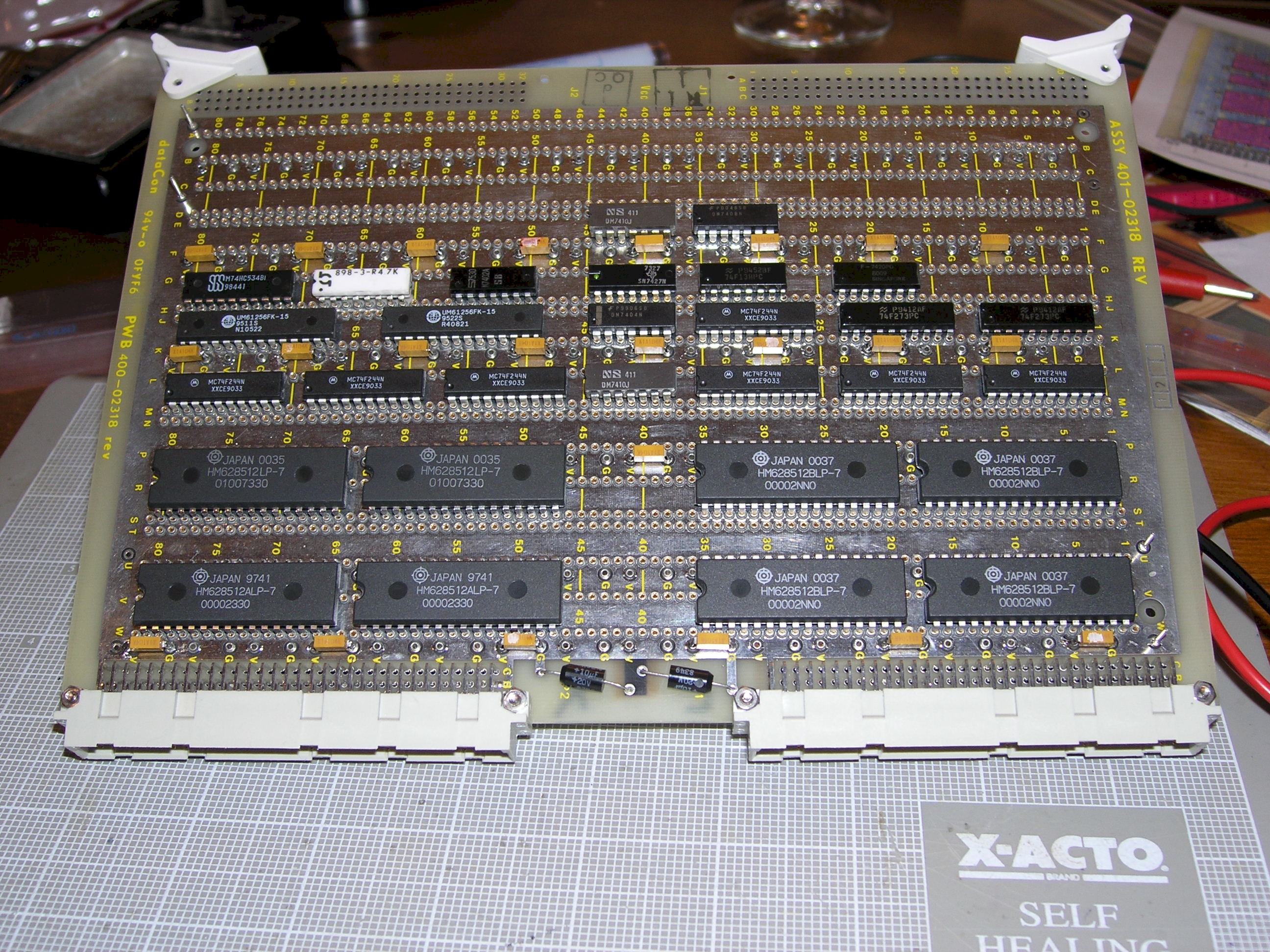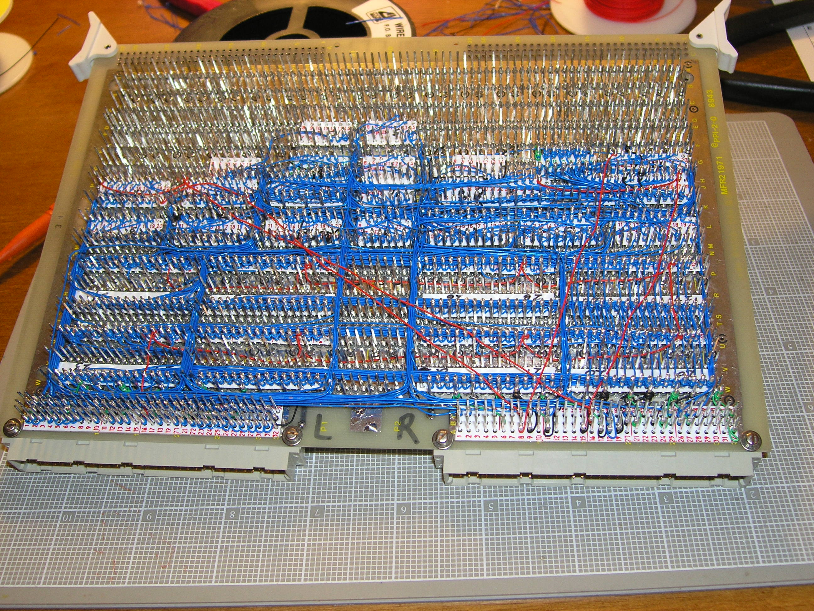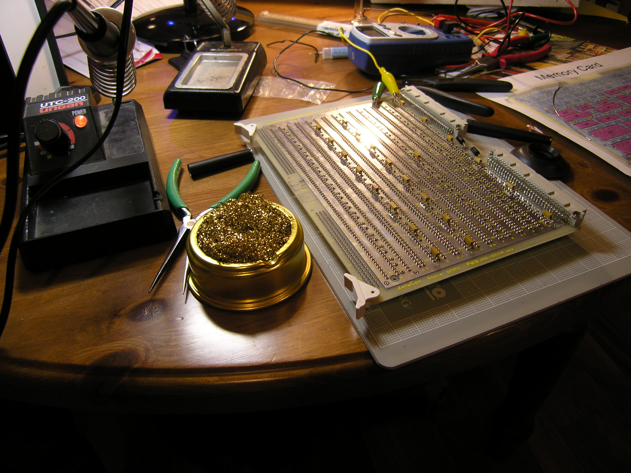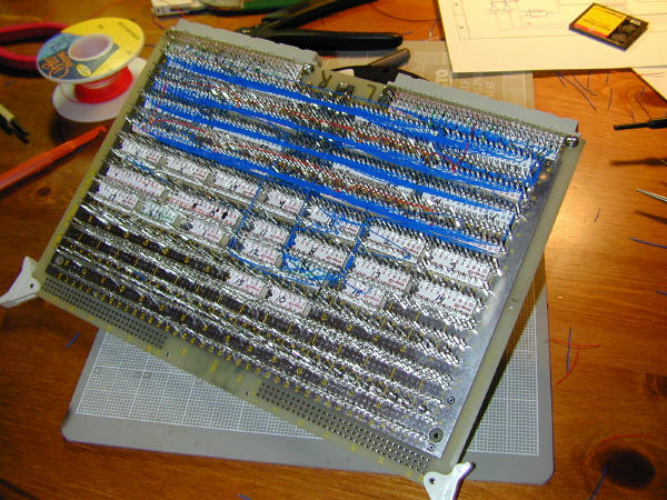 Memory Card construction [completed 2/9/2004]2/9/2004Had my testing session, and decided to call the card compete at this time. I didn't test it with the probe quite as well as I tested the front panel logic card, but my problem what that to do the comprehensive testing I had in mind, I'd need a lot more of those wires with clips on the end. For this card, there are a lot of signals that combine to determine who is driving what bus, and in which direction. I did basic testing for all of the big groupings, but typically only tested one bit of output per package. I'm not going to skip the testing, but rather defer it until the device card is complete. Once I have the device card (and a couple of banks of DIP switches on the temporary front panel assembly, I will be able to much more easily test the memory functionality. So, I'm declaring the card complete, but will perform additional tests in conjuction with the device card. Ship it. 2/8/2004Okay, the memory card is "complete" again. I added the new wiring the for bi-directional bus drivers and associated control signal tweaking. That went pretty quick. Fortunately, I thougt it best to go ahead and use the continuity checker to test every single connection on the board, as the number of changes left me somewhat less than confident that all was right with the world. Glad I did. I found one silly error (that would have been caught fairly quickly - I got the backplane pin wrong for L_MAR1). However, I also found four somewhat unsettling errors: wires which looked just fine, but were broken inside of the insulation. All four were in the address bus wiring in the SRAM, and further, all four were wires that bridged the big gap in the middle. I'm not sure how they broke - whether I did it at wrap time, or the breaks were caused by stress of subsequent wires. I'm guessing the latter. From here on out I'm going to be more careful about leaving slack. I probably went a bit overboard in my efforts to avoid a loose rat's nest. I'm also going to continuity check every connection. It was mind-numbingly boring and took a long time, but it would have taken much longer to track those things down later. Next up is live testing. With the board powered up, I believe I can test a lot using my logic probe and logic pulser. I will save some of the more interesting SRAM testing for when I have the device board built. Hope to start layout of that board within a few days. My goal is to be in a position to build and test the control board during the week I'm taking off between jobs (Feb 20-Mar 1). 2/7/2004Well, it's not finished after all. While preparing for testing, I realized that a recent bug fix I'd made introduced another serious defect. I had originally neglected to buffer the output of the page table where it drives the high order 11 address bus bits. I noticed this a while back and inserted a pair of 74F244 bus drivers between the page table SRAM and the address bus. In doing so, I somehow neglected to consider that fact that the data output of the page table SRAM needs to not only be read, but written with the page table entries. 74F244s are one-way bus drivers - and left me without the ability to write to page table memory. My biggest mistake, though, was laziness. After making the change, I decided it trivial enough that it wasn't worth updating my simulator. Had I updated the simulator, my error would have been caught and corrected long before I started wiring things up. So, here's the result: In order to fix this, I am having to replace U18 and U19 with 74F245 bi-directional bus drivers. That means yanking out a bunch of wires, which turns out to be a lot more difficult and danger-prone than you might think. Unwrapping often results in tiny wire fragments breaking off, and I had quite of bit of difficulty tracing the right wires to remove when they went through some of my tight bundles. I've completed removing wires, and I hope I haven't damaged anything. I'll add the new wires next session. Ouch. 2/6/2004Finished the memory card construction. Soldering in the bypass caps went a little better this time. My new 40 watt iron was certainly enough to get good solder connections, but I found it a bit unwieldy. I ended up using my old Ungar set at its highest temperature. After the caps were down, I checked for cold joints - and found a few. Fixed them with the big 40-watt iron. It went well. Here's a view of the component side: And a view just after getting the bypass caps in: Testing of this card is going to be a bit tricky, and very repetitive. I'm temped to put it off until the device card in complete. With the device card in, I can use the front panel switches to load, store and view memory. However, I think it best if I go ahead and do all the testing I can now before starting on the next board. I'll try to find some testing time this weekend. I did, however, apply power to the board briefly. It draws about 600mA, about what I expected. 2/3/2004Discovered that if an expensive digital camera is dropped from about 5 feet onto concrete, it is quite possible to destroy it. Oh well, it was 4 years old. So, got a new camera and haven't quite figured out how to use it. But, here goes: The memory card is very nearly complete. All of the signal wires are in. What's left is wiring up power/ground for each device and then soldering in the bypass capacitors on the component side. Should be able to finish in one more session. Note that I'm trying out my strategy for avoiding cross-talk on the important lines. Any wire connected to an edge-sensitive input uses red wire. All normal signal lines are blue. Ground is black and Vcc is green. The blue lines are constrained to follow the layout grid, unless the destination device is adjacent. This results in some fairly dense wire bundles, which I understand can lead to crosstalk. My assumption is that crosstalk is okay for level-senstive lines, because there will be enough time for the noise to settle. The red lines avoid