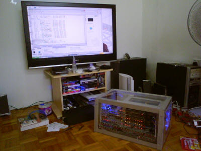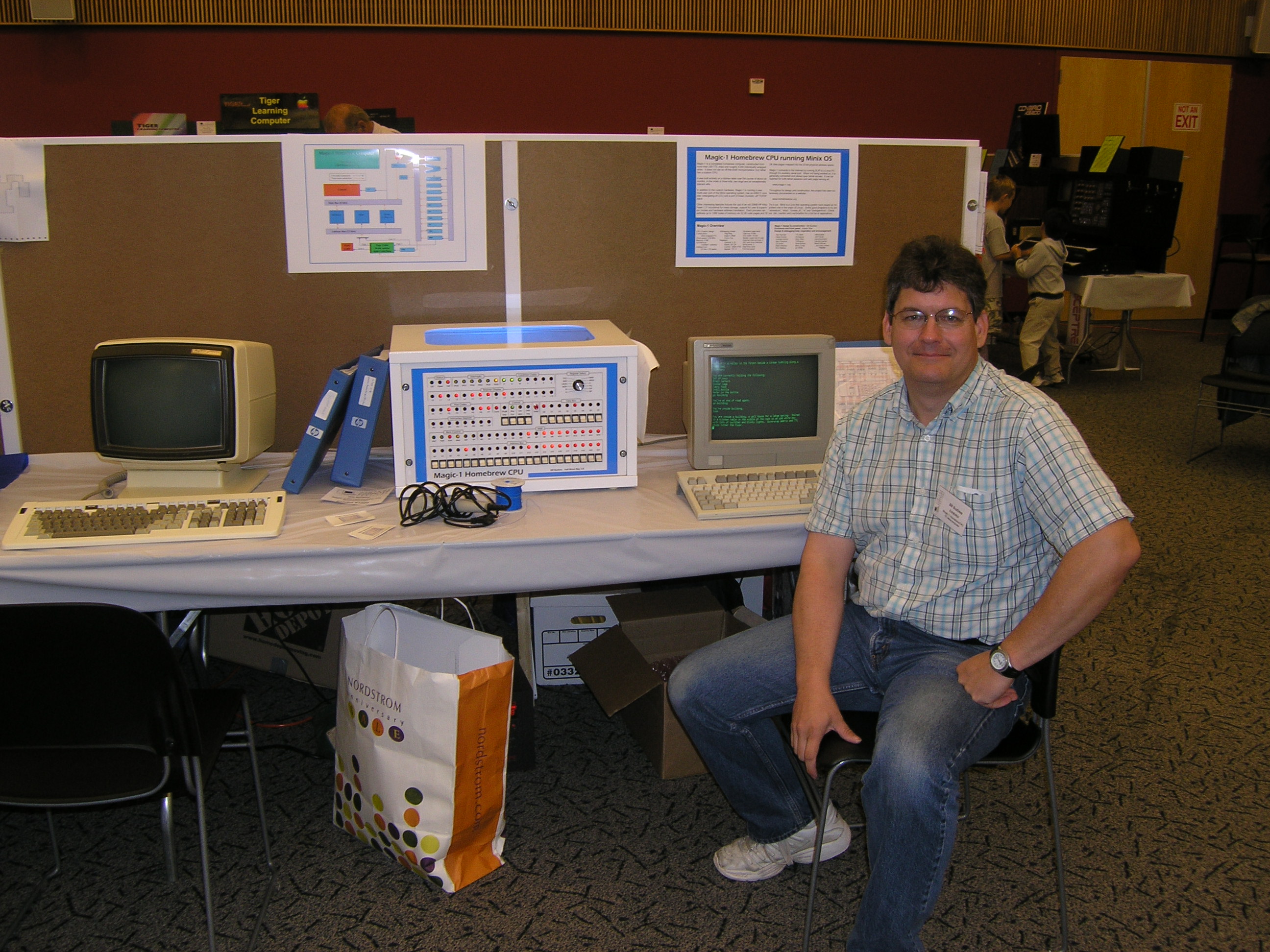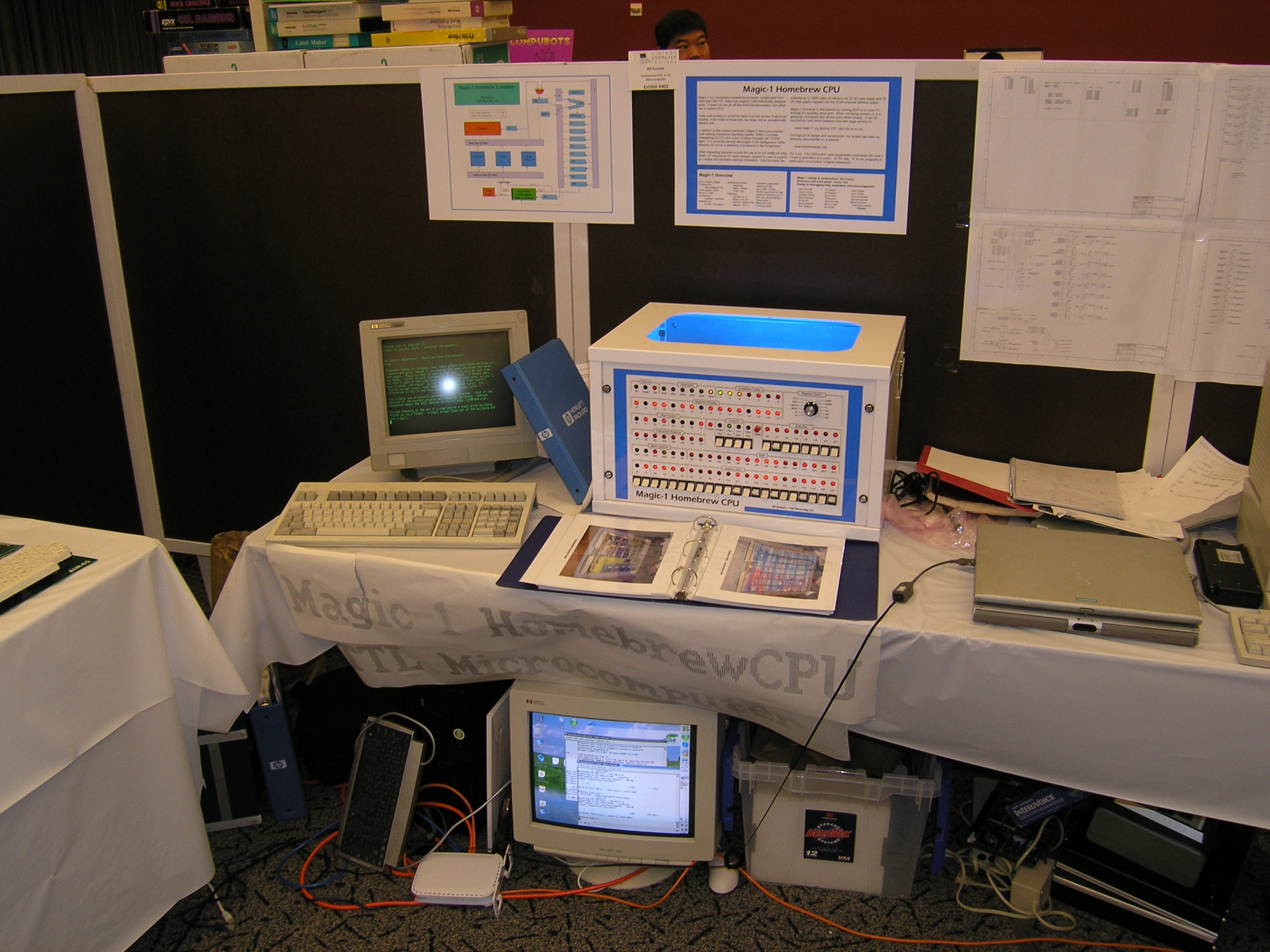 A lot of the people who stopped to talk about Magic-1 told me of their early computing experiences, and the machines they worked on or built back in the 70's and 80's. Several of them I recognized as active participants of the old Homebrew Computer Club from which Apple Computer arose. That was pretty cool.... Thanks to everyone who dropped by, and to Ken Sumrall - who took over my table several times each day to give me a break. 5/16/2007I've pulled Magic-1 offline to clean it up and get everything ready for this weekend's Maker Faire. Ken Sumrall lent me an old HP green-screen terminal, and it looks really good. I'm always a little nervous whenever I move the machine or pull cards, but it seemed to survive the move to the kitchen table and a good cleaning just fine. While I had things apart, I put in what I expect to be the oscillators for the final clock values - 3.67 Mhz and 4.09 Mhz. I had been running at 4.2 Mhz, but noticed some occasional I/O errors. 4.09 is fast enough. I'll use the 3.67 as a conservative fallback in case I start suspecting problems at 4.09. I'm not sure what the Maker Faire is going to be like, but it sounds like fun. Maia is excited about going - not to see her nerdy father, or course - but it looks like there are going to be a lot of craft activities for her. Anyway, besides taking Magic-1, I think I'll also bring the original memory card to show an example of wire-wrap. For that matter, I should also bring the wire-wrap gun, wire, a pile of chips, etc. in case anyone is interested in how it all went together. Also, might as well bring my combo Nixie tube/Dekatron tube clock (probably better stop there - too much stuff already). 5/1/2007Because I'm not going to be able to get the Minix port finished in time for the Maker Faire, I decided I needed to do something new for Magic-1 to show off. So, I've been working on getting the curses and termcap libraries from Minix ported over to my hack OS. Along the way I've had to add some new system calls, but it's starting to look pretty good. I've replaced the old 2-D Tic-Tac-Toe game with one that uses curses to draw the game board on the screen rather than just scroll (curses & termcap enable programs to directly place the cursor on the screen at x,y coordinates on a terminal screen). Right now I'm assuming that the telnet window used to access Magic-1 supports xterm cursor control codes. I've still got some bugs to work out, though. Tic-Tac-Toe works fine, but I'm having some problems with a curses version of Conway's Life program. This should open up a new set of game porting possibilities, and perhaps I'll even try the port of the vi clone. 4/24/2007It looks like my internet connection problems are finally over. A couple of weeks ago I started noticing hangs of Magic-1's web server. It was strange - other programs worked just fine and I could ping the machine. I went through my standard diagnostic actions (reboot, run verification tests, reseat all the chips, etc.), but found no obvious problem. Anyway, to make a long story short, it turns out that my DSL modem was failing. I'm running with a borrowed one right now, and everything is working again. This cost me enough time, though, that I probably won't be able to complete the Minix port in time for the Maker Faire. I'll see how far I can get. I'll record my progress over on the Minix Port page. 4/18/2007I've taken a bit of a break with this project lately, but hope to restart the Minix port soon. Magic-1 is set to be on display at the Maker Faire on May 19-20 at the San Mateo, CA fairgrounds. Details here. I had hoped to complete the Minix port in time for this event, but I doubt that will happen - I've been much too busy at home and work, and am having difficulty finding time for my projects. Overall, Magic-1 seems to be running pretty well. A few months ago I finally got around to seeing just how far i could push the clock. I ordered some custom oscillators from Digikey at 4.1 Mhz, 4.2Mhz, 4.3 Mhz and 4.4 Mhz. The verdict: Magic-1 runs at 4.2 Mhz, but not at 4.3 Mhz. So, since January I've been running Magic-1 at 4.2 Mhz. That's going to be the final top speed. As far as stability goes, I have been having some difficulty lately with the web server. I'm not yet sure, though, that it's a Magic-1 problem or just a home networking problem. I had one case in which I believed that Magic-1 was broken, but later discovered that my problems went away after cycling power on my router. Not helping matters has been my home DSL service - which has been very poor lately. The latest theory from the phone company is that my house is just a little too far away from the switch to support the speeds I'm trying to get, so we're going to try downgrading my service to see if that clears up the problem. For the Minix port effort, I have spent a little time cleaning up my development environment. I'm doing the work using a Linux virtual machine on my Windows XP host laptop. Previously I was using Fedora Core 5 with a Parallels Virtual Machine. I've now rolled to Ubuntu 7.04 under VMWare Workstation. Both worked, but VMWare has some especially nice features. In particular, cursor handling and the ability to generate images that can be played using their free VMPlayer. Finally, I decided to write a Magic-1 functional simulator for the Minix port effort. The time I spend writing it will be quickly made up during the port. It will be much easier to debug Minix on Magic-1 in simulation than on the real hardware. 11/8/2006The big news on the Magic-1 front comes from Aidil Jazmi of Universiti Teknologi Petronas. As part of his final year project, Aidil built a fantastic working clone of Magic-1. This is a really impressive accomplishment. it's tough enough for me to understand my own incomplete documentation, but Aidil was able to fill in the gaps. Not only does it work, but it also looks really fantastic. Aidil built a clear enclosure that really shows off his work. Fantastic stuff, and it 