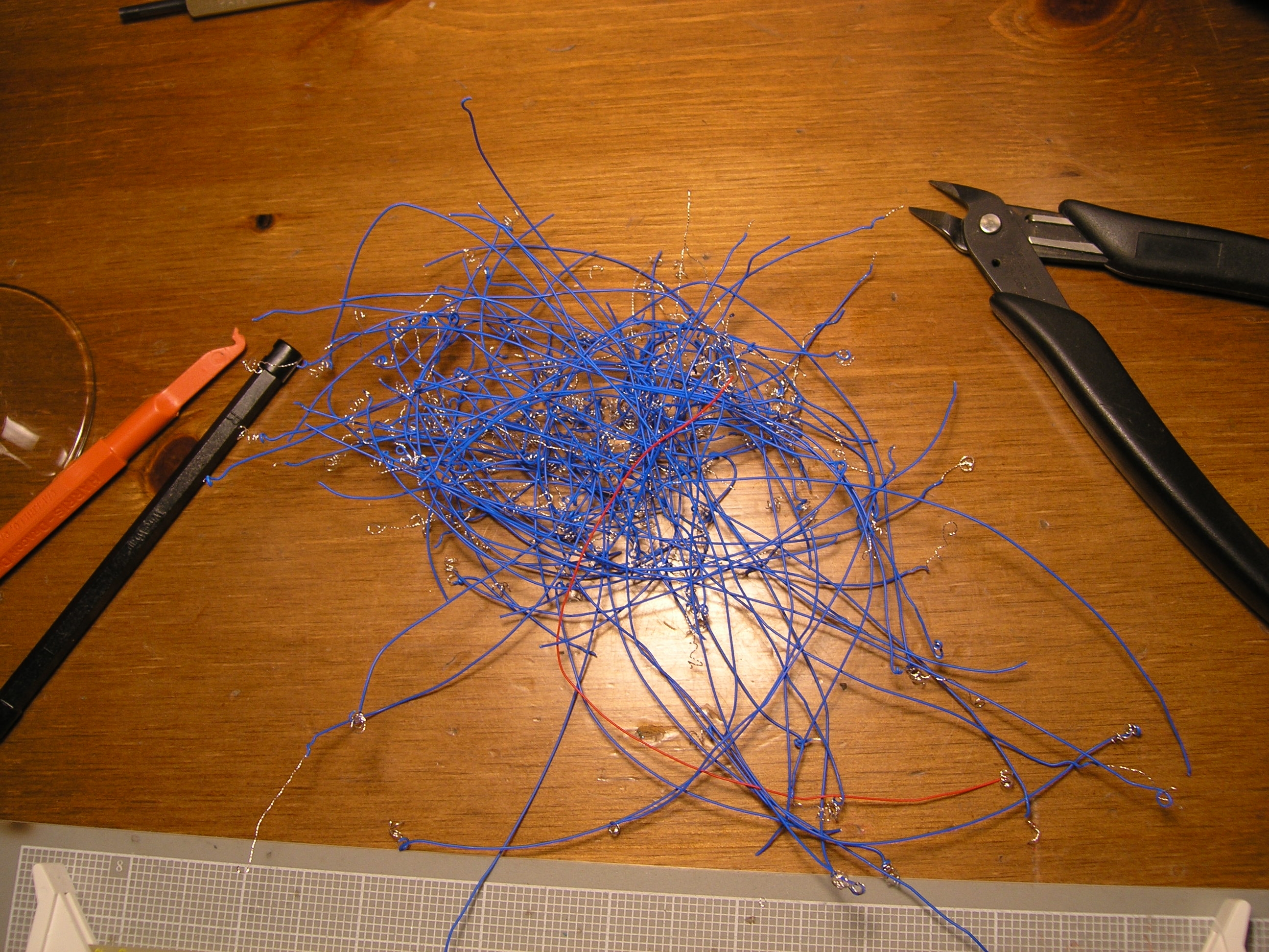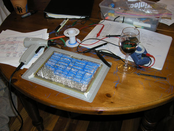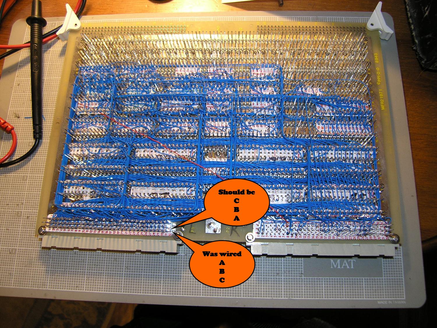 12/7/2005The new memory board is almost up and running now. I found the big problem last night, and what's left is a small design error that I'll deal with tonight. The problem that was causing me so much trouble this past week turned out to be a short between a signal line and the power pin next to it. It was a tough problem to find - I did two full board beep-outs and everything looked good. However, I could see no possible reason for my failing behavior except for a wiring issue. So, I decided to do yet another beep-out - but this time after I verified each connection I would also tap power and ground to see if there were any hidden shorts. Luckily, I found one about an hour into the process. It was a bad wrap - I must have pulled the gun off the pin before it completely wrapped, and a near-invisible end of the wrapped wire reached out and was touching the pin next to it. After finding that, I did a very close visual inspection of each pin with a powerful magnifying glass - something I probably should have done to start with. With that fixed, the machine booted up just fine. However, when I tried running a user-mode program it seemed to hang with constant drive activity. I turned on kernel verbose messages and discovered that when it launched a user process it would successfully fault in a few pages, but then get into an endless page fault loop. The problem turned out to be a minor design error. When I take a page fault, the fault handler is passed the faulting virtual address, but it also needs to know whether that address was in code space or data space. This information is passed via a bit in the machine status word, and is captured at the time of the memory fault. The bit in question is CODE_PTB, and is also one of the signals I'm capturing to enable address generation a half-cycle early. The problem is that the value of CODE_PTB that is captured at fault time is now not necessarily the one used to generate the address. That is the new xCODE_PTB signal generated on the new memory board (see "Page Table" schematic sheet). The fix is pretty simple - just have the MSW capture xCODE_PTB instead of CODE_PTB at fault time. The only messy thing is that xCODE_PTB is a signal local to the memory card, whereas the MSW lives on the register card. So, I'll have to send xCODE_PTB across the backplane. To do that, I'll need to free up a backplane signal wire by getting rid of one of the redundant +5 or gnd lines. I'll also make a small change on the old memory card so that it can still be used if I need to switch back for some reason. I also need to add some more decoupling capacitors to the new memory board. When I did the soldering on the board, I only had 10 decoupling caps. I've since gotten a bunch more, and will put in a couple dozen for good measure. Then, finally, I can start pushing the clock to see if I can get close to my original 4 Mhz target. 12/5/2005Still working of bringing up the new memory board. It all works fine so long as I don't turn paging on - but as soon as I do Magic-1 locks up on the next memory reference. It believes the next reference is a not-present page fault, and then goes into an endless fault loop when it tries to dump the machine context on the kernel stack (which it also believe is neither present nor writeable). What I thought would be the obvious problems that could lead to this situation check out okay. I've had to do a bit of rework on this board, so my earlier beeping out(s) may be outdated. When I find a few hours I'll do yet another beep-out on the board. Meanwhile, I've gone back to the old board and put Magic-1 back online. 11/30/2005I stayed up way too late, but finished the rewiring. It was ugly. One of the big problems with rework on a densely-wired board is that the wire-wrap bit sometimes won't cleanly fit over a post because there are too many wires bundled up next to it. I had quite a few of those - and they were pretty tricky to get. My other big concern is that I am almost out of my special cut-strip-wrap wire. I probably only have ten feet or so left. Besides being expensive, it's also somewhat difficult to get. Last time I ordered it, there was a two-month delay before the order was filled. I'll have to beep out the entire board again before I try a live test. Perhaps tommorow. Here's the kitchen table aftermath from tonight's work: 11/29/2005Ripping out wires is among my least favorite tasks - but I guess it could have been a lot worse. Most of the wires were top-level, so I only had to undo a few dozen secondary wires. Here's the pile: All together, I had to pull just over 100 wires. It should take me about two evening work sessions to replace them in the proper location, and then another session to beep out the board again. Meanwhile, I've put Magic-1 back online with the old memory card. 11/28/2005Arrghh! Is it possible to be this stupid? I spent many hours last week wire-wrapping the new memory card, and the last couple of days beeping it out and desk-checking the design. It all looked good. Then, not unexpectedly, it failed when installed in Magic-1. However, it failed in some really strange ways - ways it shouldn't possibly fail. Signals were all weird - it seemed like half the backplane was shorting out. And in fact, it was. It's been nearly two years since I laid out the first Magic-1 board, and I forgot a small detail. The way I was using the 96-pin wire-wrap tags on both the backplane and the cards meant that I had to pick one that would have the rows "A", "B" and "C" reversed from the labelling. I chose to have the backplane match the wire-wrap tag labels, and reverse the board labels. I forgot this when building the new memory card. Shit. Here's the new card: The rows of the two 96-pin backplane connectors were wired backwards. Row A was wired as row C, and row C was wired as row A. This will require a lot of work to fix - it isn't just a matter of removing single wires. Each wire I remove could result in having to pull two a