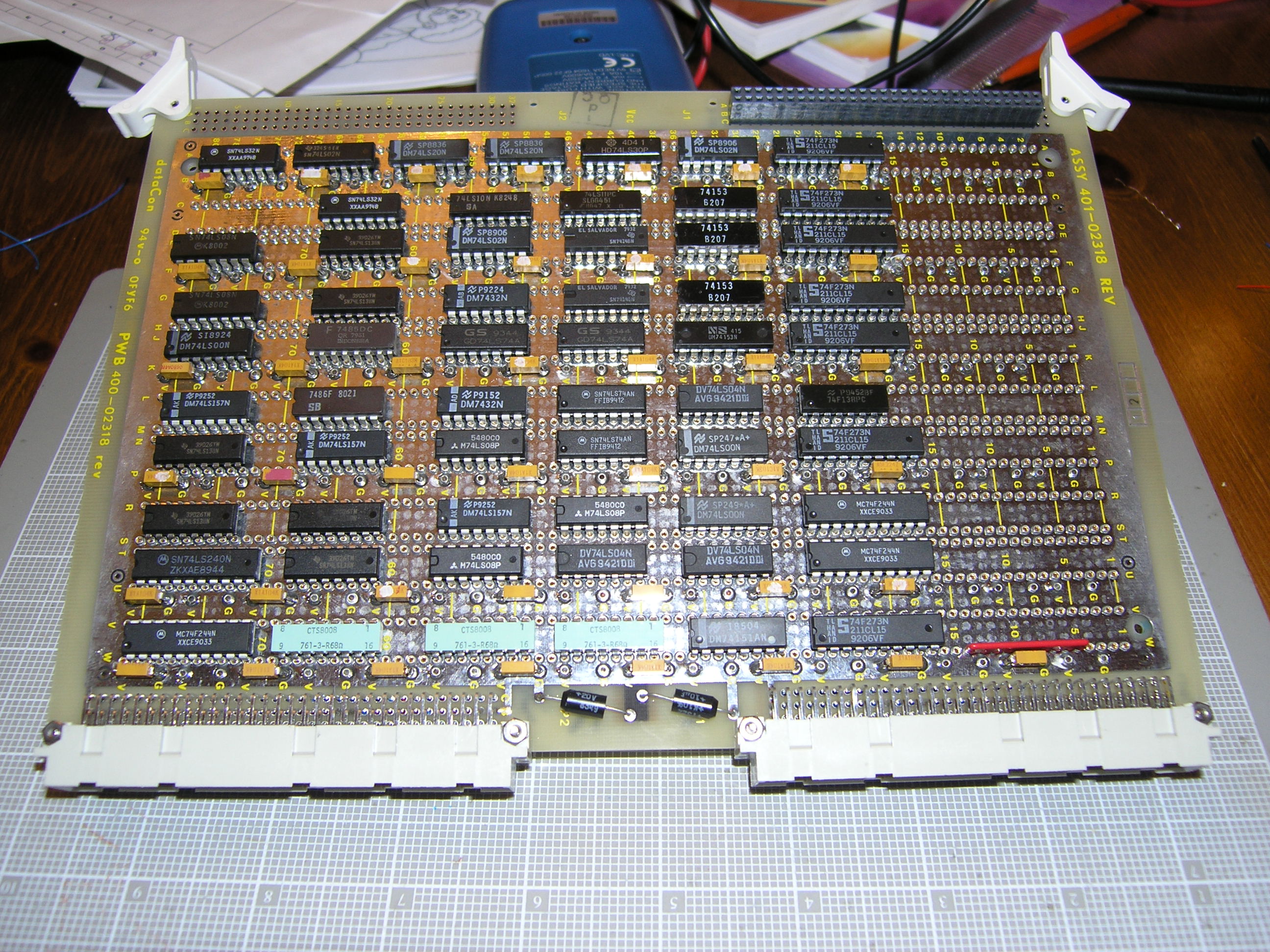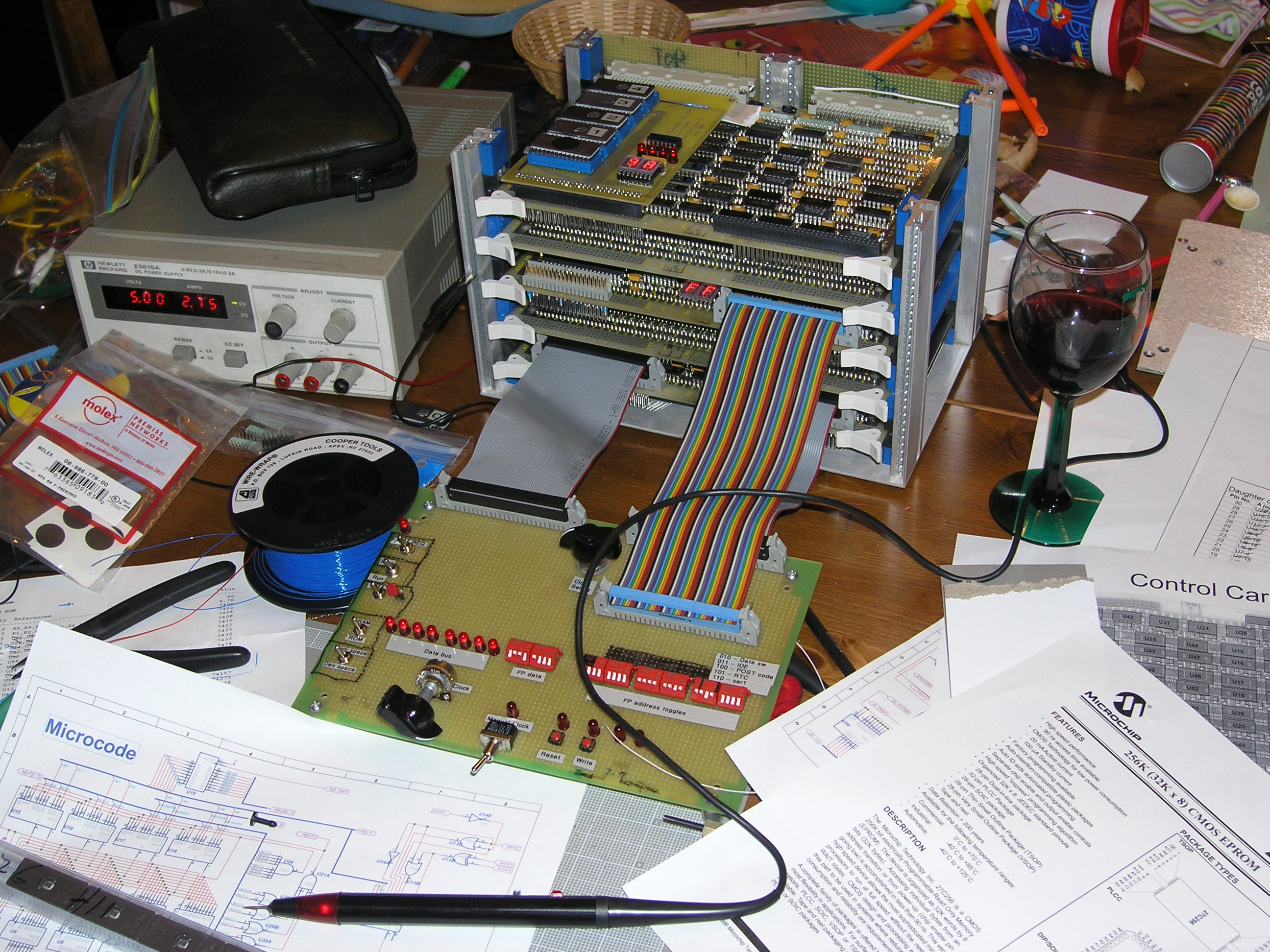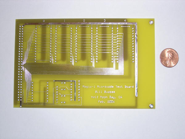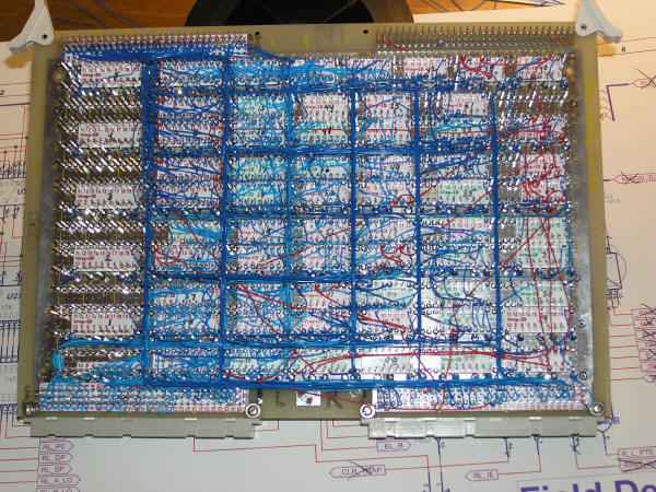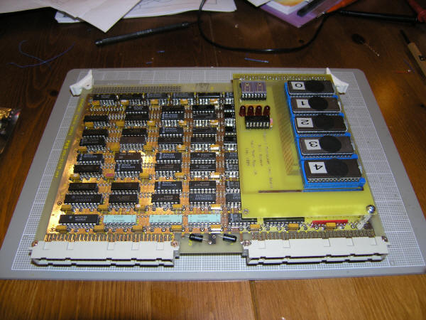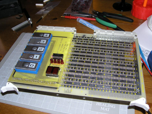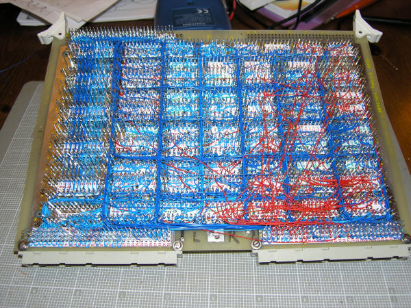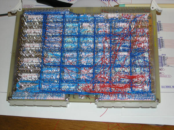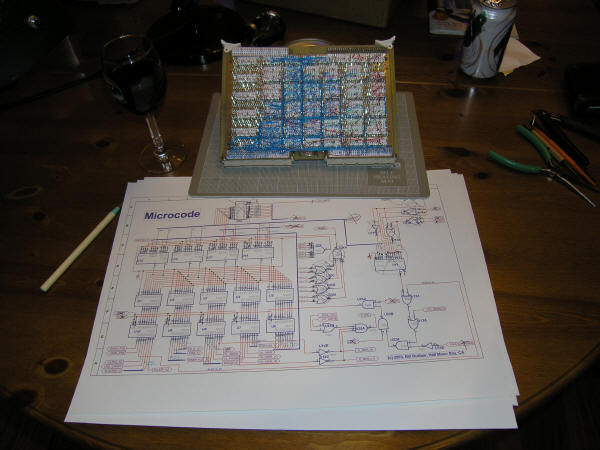 Control Card construction [completed 3/19/2004]The control card will be the most complex and difficult one to build. One of the complications is that although I am planning on using 5 20-pin .3 package PROMs for the microcode, I'm a bit nervous about locating enough good 512x8 PROMs.. I have enough for 3 sets of microcode, but an early attempt to test program one of them has failed. I won't try any more tests until I know I have good microcode because these things are programmed only once. They are also getting to be quite hard to find and expensive. So, during bring-up I'll be using 70-nanosecond 27C256 EPROMs (32Kx8). These devices, however, come in a .6 28-pin package. I will be constructing a daughter card to hold them. To give myself a safety net, though, I've also decided to layout the PROM on the control card with enough space for the EPROMs. That way if I run into PROM trouble, I can do some simple rewiring and just use the EPROM directly on the control card. 3/19/2004Finished up beeping out the control card, and found three problems. One was a wire that was off by one, and then I had two wires that were broken inside of the insulation. Both went through the same tight corner, so they were probably snapped because of wire pressure. Have to be more careful about leaving slack, and limit the number of wires that go through the same posts. Anyway, control card is complete - ship it! Here's a bunch of pictures of the finished card, along with the daughter card. First, the completed assembly with daughter card in place: Closeup of the daughter card front: Closeup of the daughter card back: Component side of the control card (with "LS" series devices in place; will swap those out for vanilla 74xx later): Wire side of the control card: 3/18/2004beep. beep. ... ... beep. .. damn! .. trace bad wire, rip 'em out, rewire ... beep. beep. beep. beep. beep. .. . .. .. . beep 3/14/2004Completed the wiring; now have to beep out all of the connections. 3/13/2004Almost done with wrapping the control card. All that's left is wiring up the PROM to the EPROM daughter card header. The card looks a bit messy, with all of the red wires running haphazard. However, that's by design. The red wires carry edge-sensitive signals, so I'm wiring them outside of the normal channels to avoid crosstalk where it matters. Here's what it looks like now: 3/11/2004Back to wrapping wires. I've completed the wiring on the microcode sheet, the fault/interrupt sheet and about half of the field decode sheet. I'd guess two more wiring sessions, followed by a work session to beep out all of the connections with a continuity meter. That would put me on track to finish the control card this weekend, and start thinking about layout of the alu/register card. Actually, that layout should be fairly simple - it will be dominated by the busses. The project is moving along pretty fast now, so it's also time to start thinking about the front panel and enclosure Anyway, here's what wire side of the control card looks like now: 3/9/2004 - First instruction fetch/decode/execute worksNow it's really almost a computer. By putting in just a couple more wires and doing a new test microcode image, I was able to sucessfully fetch an instruction from the boot rom, decode and execute it - all without yet having the ALU and most registers in place. This worked because the shadow memory address register, MAR1, is complete on the memory card, and is reset to 0x0000 on power-up. This register is what sets up the address bus. So, when I put in the real fetch microcode sequence, it correctly grabbed the contents of address 0x0000 of the boot rom - 0x83. This is actually a branch instruction, but I changed the microcode to make it a nop that branched to another microcode sequence to signal success to me. It worked. It really worked. Wow. I then tried it fetching from SRAM instead of the boot ROM. That also worked just fine. Next up, testing conditional microcode branches. However, I think I'll go ahead and wire up the rest of the card before I do that rather than putting in a wire or two at a time. It shouldn't take me more than three or four sessions to complete the wiring. Also, because I was running up against the limit for my bench power supply (3A), I went ahead and swapped out a bunch of the 74xx glue logic devices for 74LSxx ones. This reduced the power consumption enough that I'll be able to keep using my little bench supply throughout the testing of the control card. Eventually, though, I'll put the ancient 74xx devices back in for purity's sake. Anyway, here's a new picture of the machine executing an instruction: 3/8/3004Only a few new wires tonight. Spent most of the session testing with a new set of microcode. The test was for handling of DMA requests and acknowledgement. This is likely to be used only by the front panel, but it could be used by a device if I get ambitious. It is an important test because the mechanism relies on the trap/interrupt logic. When you throw the DMA_REQ switch on the front panel, it essentially tugs on an (unmaskable) interrupt line. At the next instruction boundary - immediately prior to a fetch cycle - the DMA req interrupt is caught and the microcode sequencer vectors control off to microcode interrupt slot 0x07 (microcode address 0x107). The microcode sequence at that address then asserts the DMA_ACK signal to acknowledge receipt of the request. DMA_ACK in turn causes the memory address generation circuitry to detach from the address bus and the data bus driver to isolate the ALU and registers. Also detached is the logic to generate the _RD, _WR and MEMORY signals. This enables an external device to take control of the busses and control signals to directly fiddle with the memory and devices. The original microcode sequence was just one microinstruction long, at 0x107. It asserted DMA_ACK and then branched to FETCH. So long as DMA_REQ was asserted, that branch to FETCH would get vectored back to 0x107 and DMA