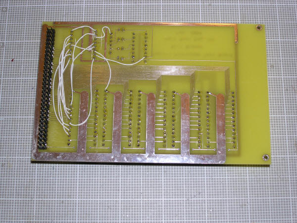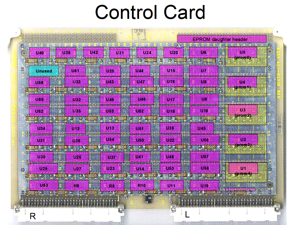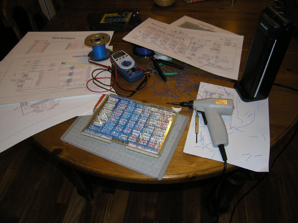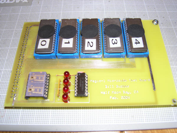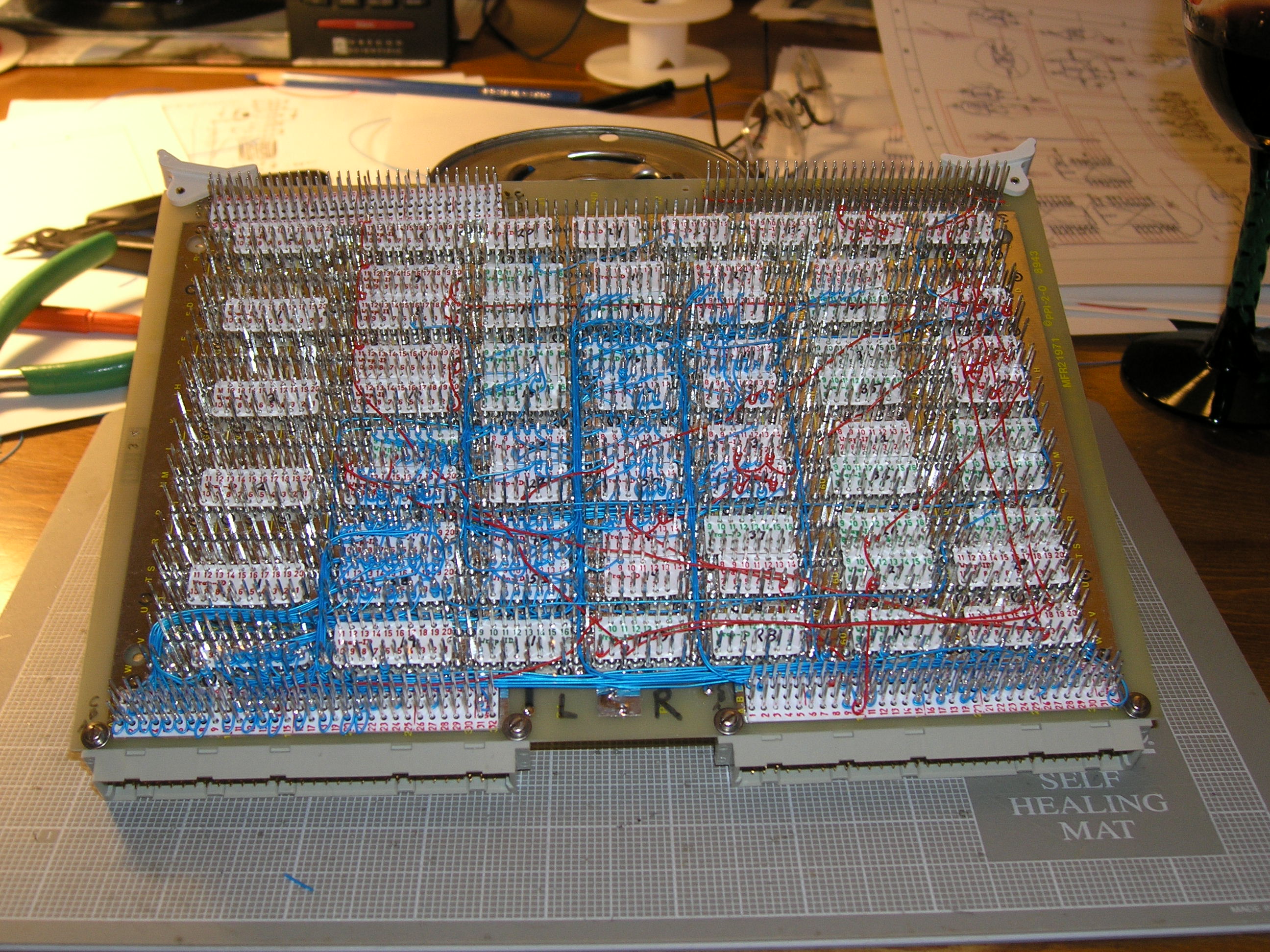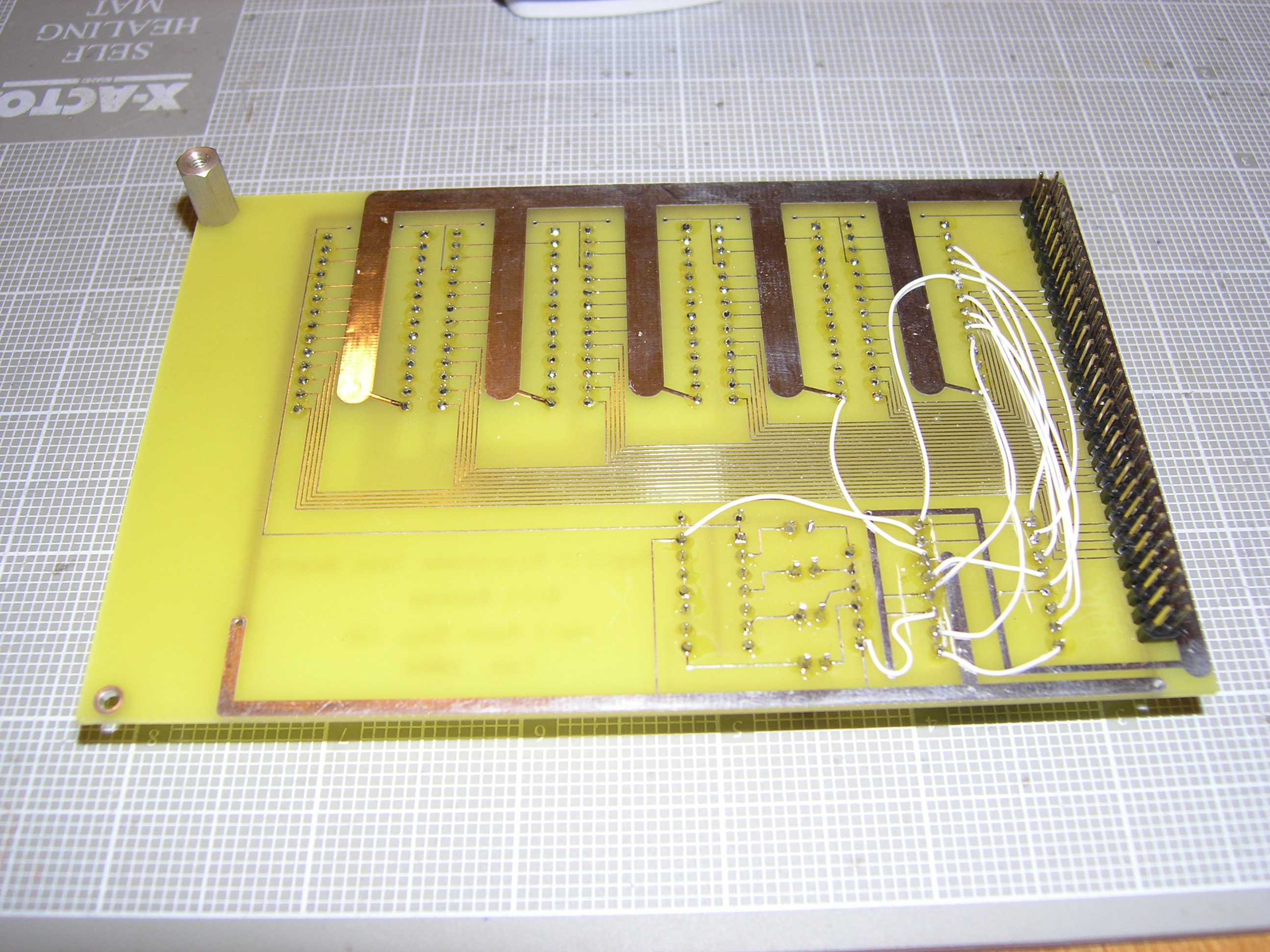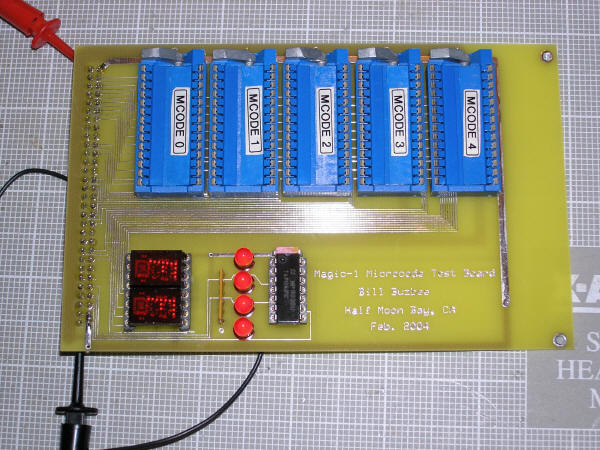 Control Card construction [completed 3/19/2004]The control card will be the most complex and difficult one to build. One of the complications is that although I am planning on using 5 20-pin .3 package PROMs for the microcode, I'm a bit nervous about locating enough good 512x8 PROMs.. I have enough for 3 sets of microcode, but an early attempt to test program one of them has failed. I won't try any more tests until I know I have good microcode because these things are programmed only once. They are also getting to be quite hard to find and expensive. So, during bring-up I'll be using 70-nanosecond 27C256 EPROMs (32Kx8). These devices, however, come in a .6 28-pin package. I will be constructing a daughter card to hold them. To give myself a safety net, though, I've also decided to layout the PROM on the control card with enough space for the EPROMs. That way if I run into PROM trouble, I can do some simple rewiring and just use the EPROM directly on the control card. 3/19/2004Finished up beeping out the control card, and found three problems. One was a wire that was off by one, and then I had two wires that were broken inside of the insulation. Both went through the same tight corner, so they were probably snapped because of wire pressure. Have to be more careful about leaving slack, and limit the number of wires that go through the same posts. Anyway, control card is complete - ship it! Here's a bunch of pictures of the finished card, along with the daughter card. First, the completed assembly with daughter card in place: Closeup of the daughter card front: Closeup of the daughter card back: Component side of the control card (with "LS" series devices in place; will swap those out for vanilla 74xx later): Wire side of the control card: 3/18/2004beep. beep. ... ... beep. .. damn! .. trace bad wire, rip 'em out, rewire ... beep. beep. beep. beep. beep. .. . .. .. . beep 3/14/2004Completed the wiring; now have to beep out all of the connections. 3/13/2004Almost done with wrapping the control card. All that's left is wiring up the PROM to the EPROM daughter card header. The card looks a bit messy, with all of the red wires running haphazard. However, that's by design. The red wires carry edge-sensitive signals, so I'm wiring them outside of the normal channels to avoid crosstalk where it matters. Here's what it looks like now: 3/11/2004Back to wrapping wires. I've completed the wiring on the microcode sheet, the fault/interrupt sheet and about half of the field decode sheet. I'd guess two more wiring sessions, followed by a work session to beep out all of the connections with a continuity meter. That would put me on track to finish the control card this weekend, and start thinking about layout of the alu/register card. Actually, that layout should be fairly simple - it will be dominated by the busses. The project is moving along pretty fast now, so it's also time to start thinking about the front panel and enclosure Anyway, here's what wire side of the control card looks like now: 3/9/2004 - First instruction fetch/decode/execute worksNow it's really almost a computer. By putting in just a couple more wires and doing a new test microcode image, I was able to sucessfully fetch an instruction from the boot rom, decode and execute it - all without yet having the ALU and most registers in place. This worked because the shadow memory address register, MAR1, is complete on the memory card, and is reset to 0x0000 on power-up. This register is what sets up the address bus. So, when I put in the real fetch microcode sequence, it correctly grabbed the contents of address 0x0000 of the boot rom - 0x83. This is actually a branch instruction, but I changed the microcode to make it a nop that branched to another microcode sequence to signal success to me. It worked. It really worked. Wow. I then tried it fetching from SRAM instead of the boot ROM. That also worked just fine. Next up, testing conditional microcode branches. However, I think I'll go ahead and wire up the rest of the card before I do that rather than putting in a wire or two at a time. It shouldn't take me more than three or four sessions to complete the wiring. Also, because I was running up against the limit for my bench power supply (3A), I went ahead and swapped out a bunch of the 74xx glue logic devices for 74LSxx ones. This reduced the power consumption enough that I'll be able to keep using my little bench supply throughout the testing of the control card. Eventually, though, I'll put the ancient 74xx devices back in for purity's sake. Anyway, here's a new picture of the machine executing an instruction: 3/8/3004Only a few new wires tonight. Spent most of the session testing with a new set of microcode. The test was for handling of DMA requests and acknowledgement. This is likely to be used only by the front panel, but it could be used by a device if I get ambitious. It is an important test because the mechanism relies on the trap/interrupt logic. When you throw the DMA_REQ switch on the front panel, it essentially tugs on an (unmaskable) interrupt line. At the next instruction boundary - immediately prior to a fetch cycle - the DMA req interrupt is caught and the microcode sequencer vectors control off to microcode interrupt slot 0x07 (microcode address 0x107). The microcode sequence at that address then asserts the DMA_ACK signal to acknowledge receipt of the request. DMA_ACK in turn causes the memory address generation circuitry to detach from the address bus and the data bus driver to isolate the ALU and registers. Also detached is the logic to generate the _RD, _WR and MEMORY signals. This enables an external device to take control of the busses and control signals to directly fiddle with the memory and devices. The original microcode sequence was just one microinstruction long, at 0x107. It asserted DMA_ACK and then branched to FETCH. So long as DMA_REQ was asserted, that branch to FETCH would get vectored back to 0x107 and DMA